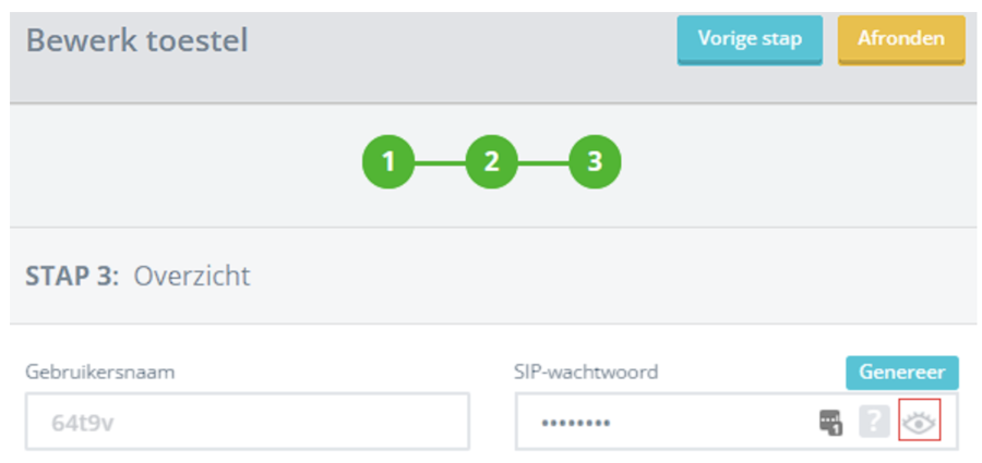 Noteer de SIP-Gegevens en stel deze in op je toestel. Gebruik voor de configuratie de zichtbare registratie richtlijnen, of bekijk de pagina: Eigen toestel registreren met SIP-instellingen.