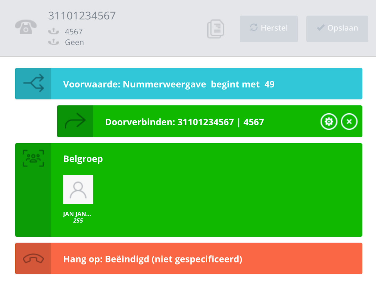 Bijvoorbeeld: als je geen oproepen wilt ontvangen van bepaalde bellers, maak je eenvoudig een voorwaarde aan die overeenkomt met die nummers en koppel je deze aan een Hang Op-actie.