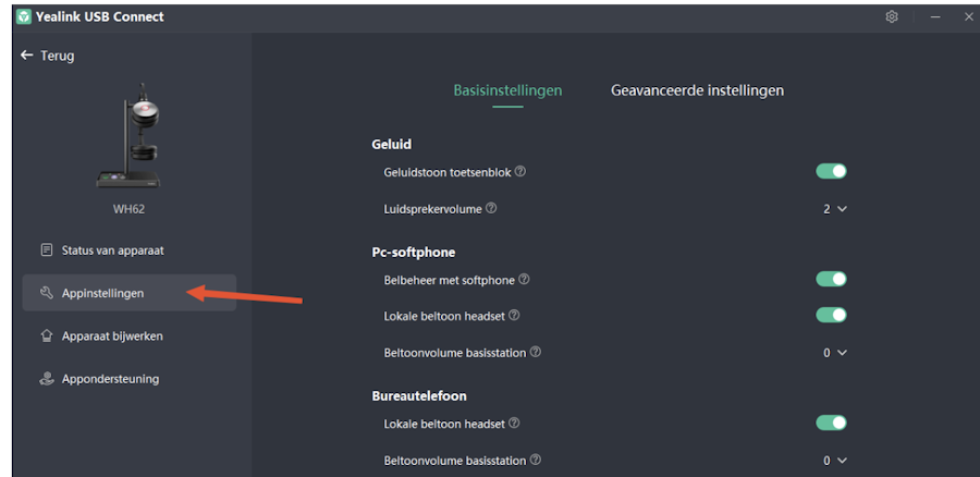Via de Yealink USB Connect software kun je ook headset instellingen beheren. Klik hiervoor op "Appinstellingen".